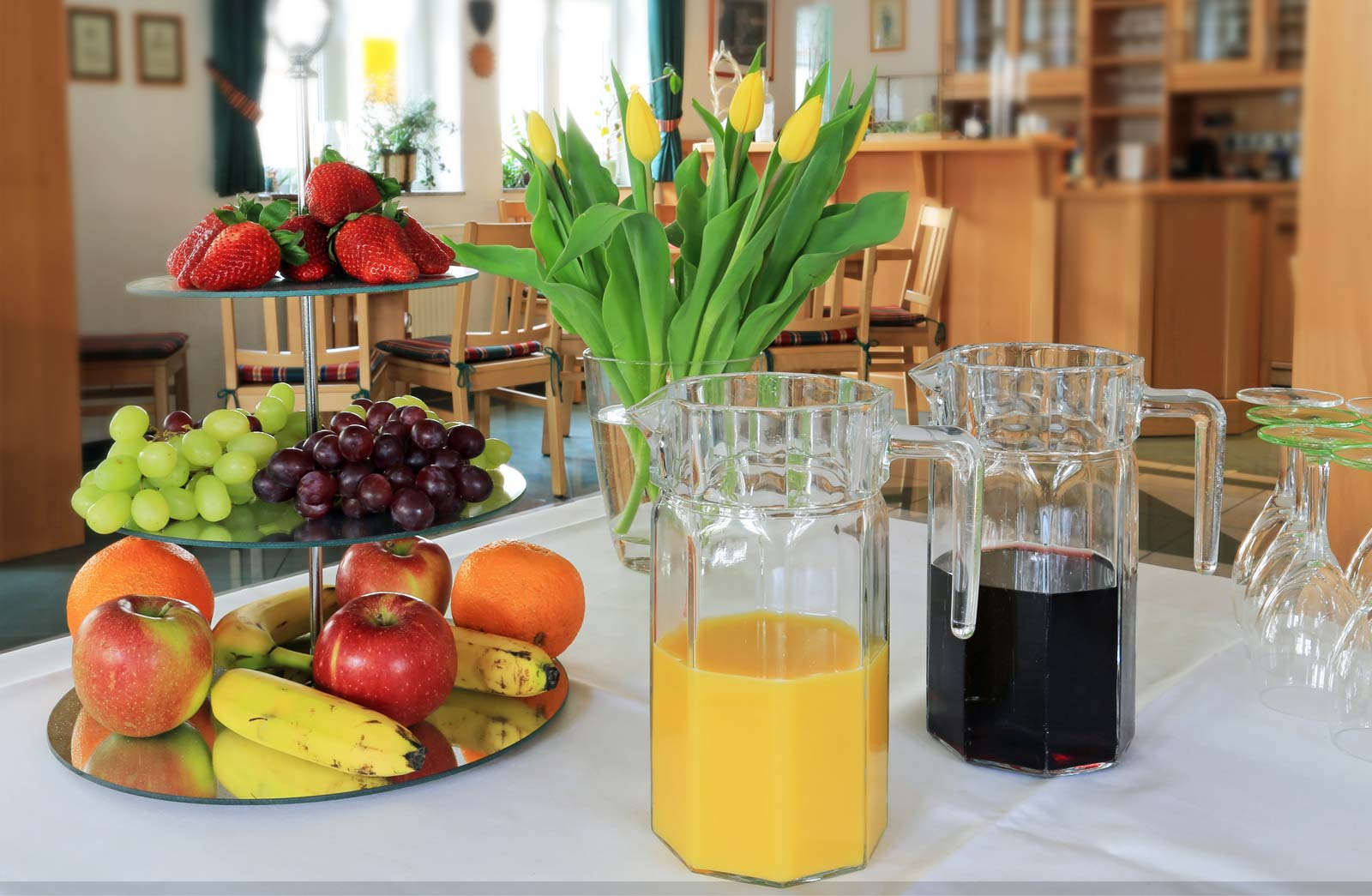 Zur Stärkung des Tages bieten wir Ihnen in unserem Frühstücksraum bei gemütlichem Ambiente ein ausgiebiges Frühstücksbuffet an. Wirelass Lan und ein Kühlschrank auf der Etage mit hauseigenen Weinen steht Ihnen zur Verfügung.